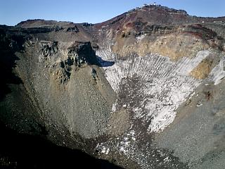 写真:富士山の噴火口。 向こうにかすかに見える白い建物が、観測所。