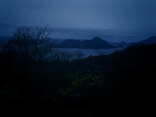 写真:夕暮れ時の洞爺湖。中山峠に行く途中に撮影。湖の向こうの中島とのバランスがいい。