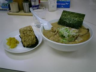 写真:とんこつしょうゆ味のラーメン(650円)とチャーシューおにぎり(150円)