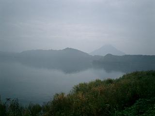 写真:指宿の山奥、イッシーで有名な池田湖。後ろに見えるのが薩摩富士、開聞岳。