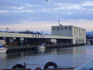 写真:沼津港。漁港なので、観光船が行き交うような華やかさは無かったが、魚市場の文字が、おいしい魚を期待させる。