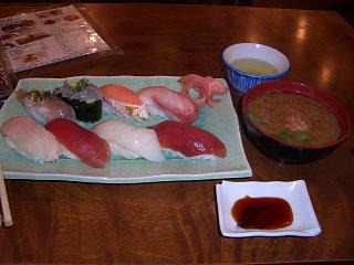 まぐろ、しらうお、はまちなど8カンに、カニ味噌汁がついている。