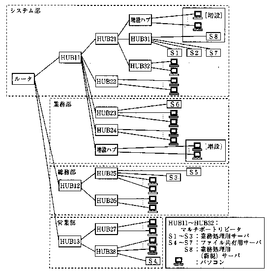 (1)業務部の増設ハブは、CSMA/CD方式の規格上の制限からHUB11に接続した。こ