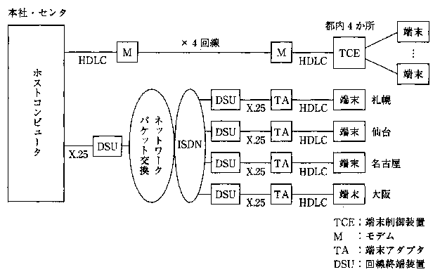 4〜8台の端末をTCEに接続している。センタとの接続形態は、アナログ専用線(3.4kHz、