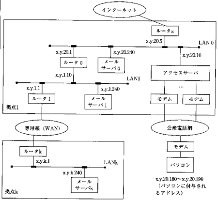 レスをもち、LANk上のIPアドレスは"x.y.k.1〜x.y.k.254"のいずれかである。各拠点の