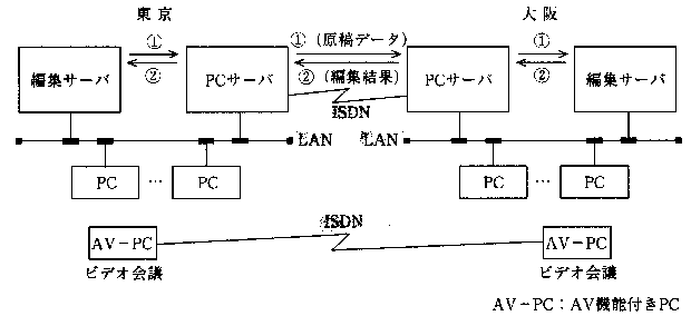 とを併用し、東京と大阪との間でページ編集処理に必要な原稿データの転送とビデオ会
