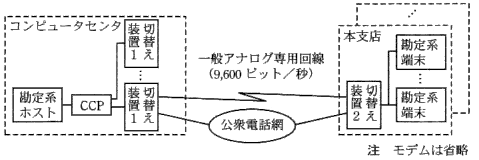 般アナログ専用回線や公衆電話網とモデムで接続している。切替え装置2と勘定系端末は
