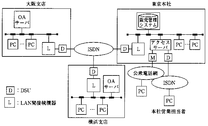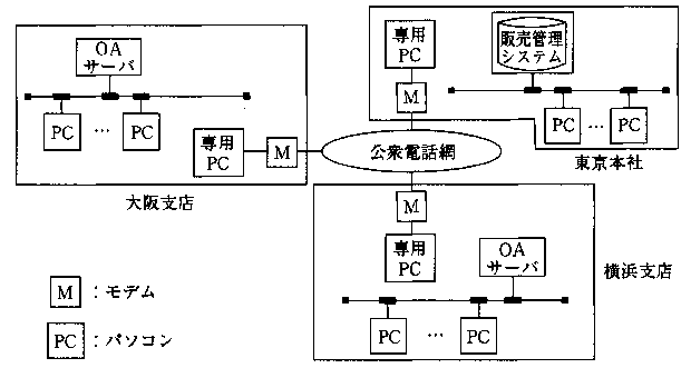 現在、本社と支店間の営業情報の受渡しは、公衆電話綱で接続された専用パソコン(以下、