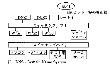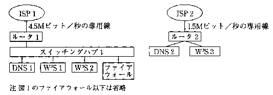 B W3S1とW3S2はISP1と4.5Mビット/秒の専用線で接続し、W3S3はISP2と1.5Mビット/秒の専用線で接続する。