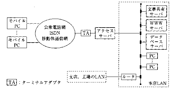 (1)モパイルPCに、利用する通信サービスに適した通信カードを装着する。 (2)モパイルPCはアクセスサーバを介して本店LANに接続する(図)。 (3)アクセスサーバはターミナルアダプタを用いてISDNと接続する。 (4)アクセスサーバは本店に設置する。 |