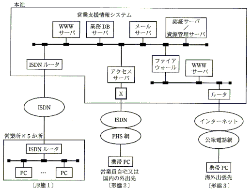 形態1:各営業所の営業員個々のPCからISDN経由で本社に接続する。