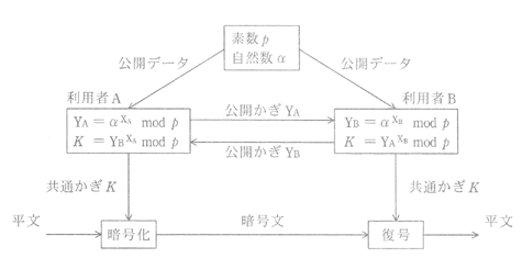 る2者間で機密情報を送信する仕組みを作る。まず,利用者Aと利用者BはDH法