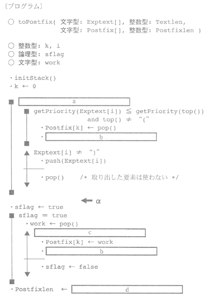 (6) toPostfixは,スタックを初期化する手続initStack,数式の要素をスタッ