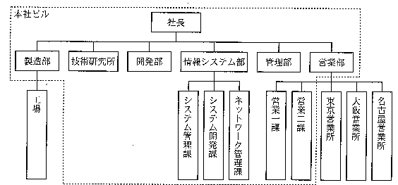 X社の組織は、図1のとおりである。ある地方都市の郊外に本社ピルがあり、同じ