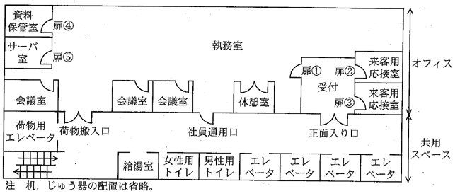 | 正面入り口 | シリンダ錠 | 朝,最初に出社した社員が開錠し,最終退出者が施錠する。施 錠中,かぎは,管理室に預ける。 |